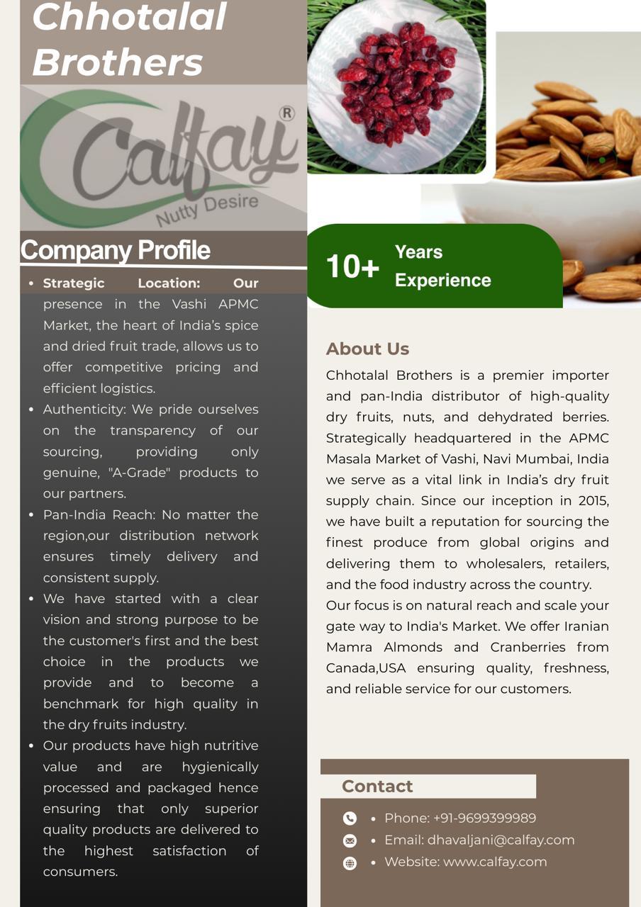Functioning on the principles of fair play and relentless efforts Calfay has introduced diversified range of finest quality products like Iranian Mamra Almonds, Iranian Pistachios, Cranberry etc.